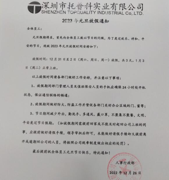 深圳托普科實業2023年元旦放假公告