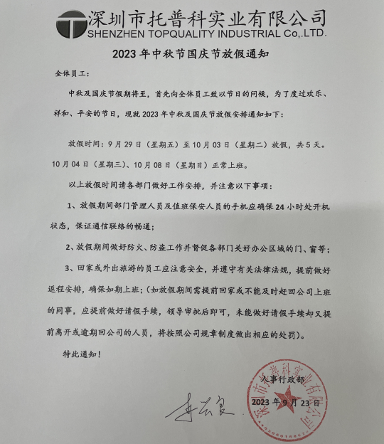托普科實業2023年中秋國慶放假通知